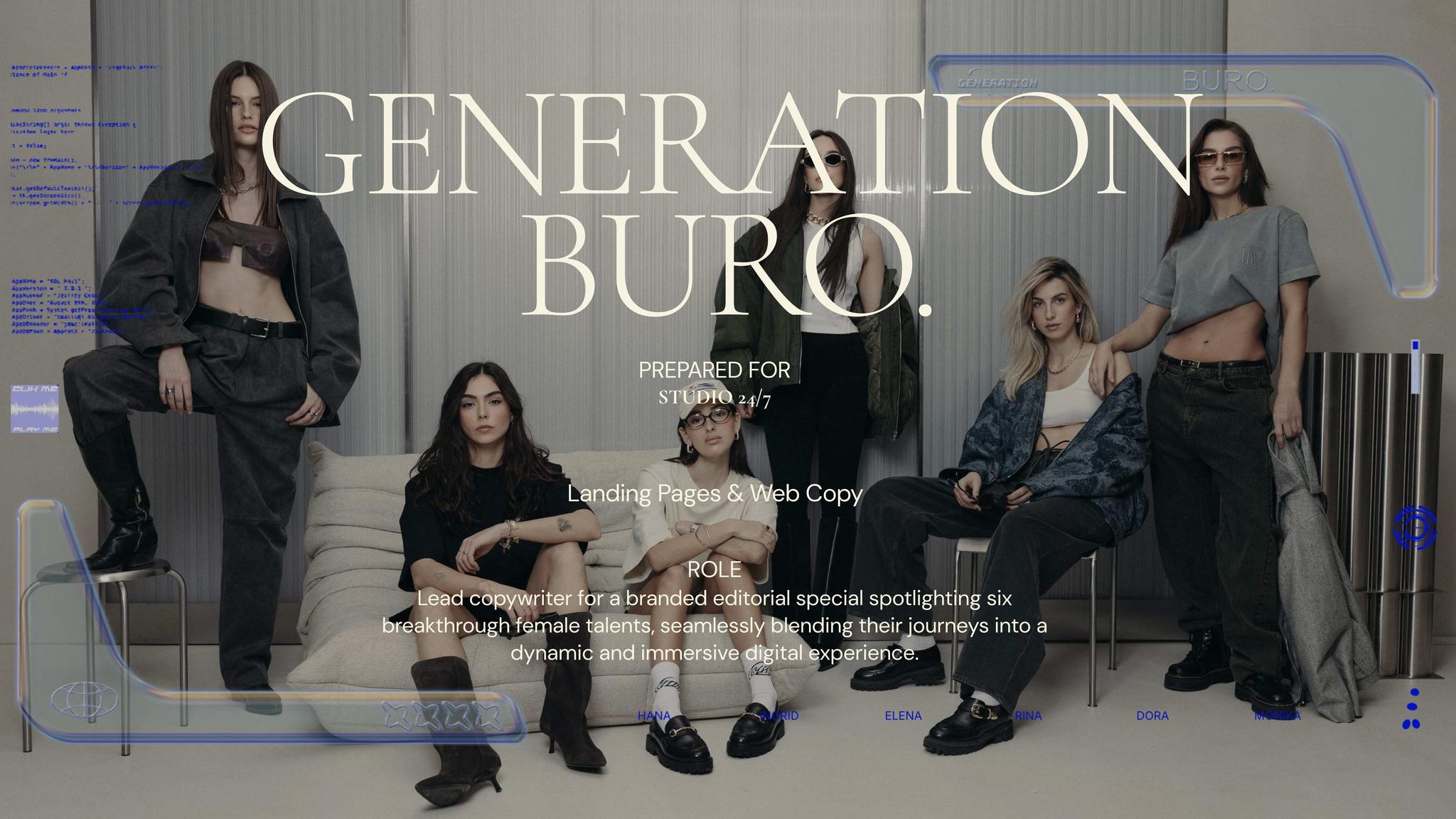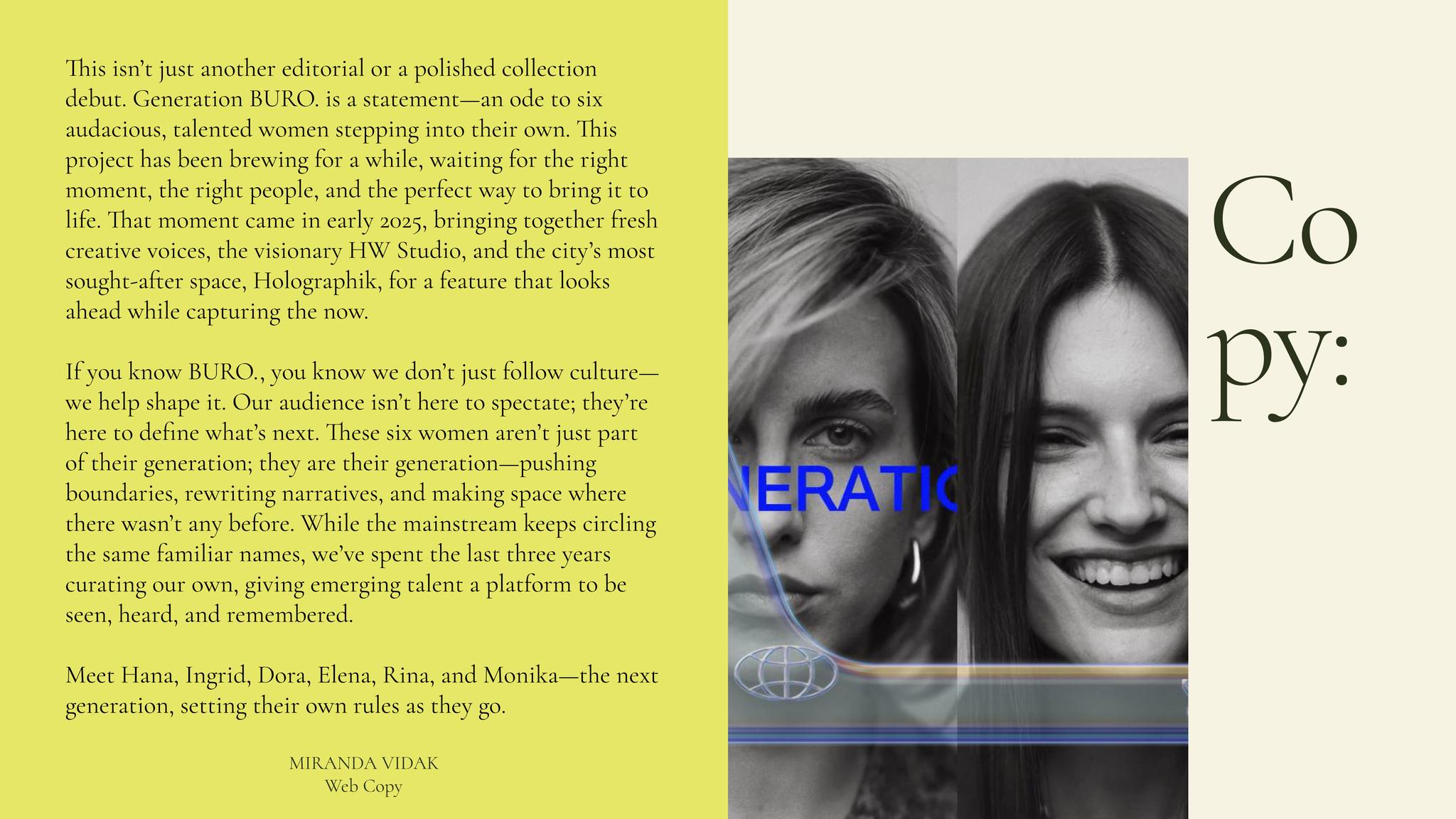 For BURO. Magazine, I crafted an engaging and informative editorial special spotlighting six breakthrough female talents, seamlessly weaving their journeys into a dynamic and immersive digital experience. I developed a compelling narrative that celebrates emerging creative talent while positioning BURO. as a premier digital platform for amplifying new voices and shaping cultural conversations.