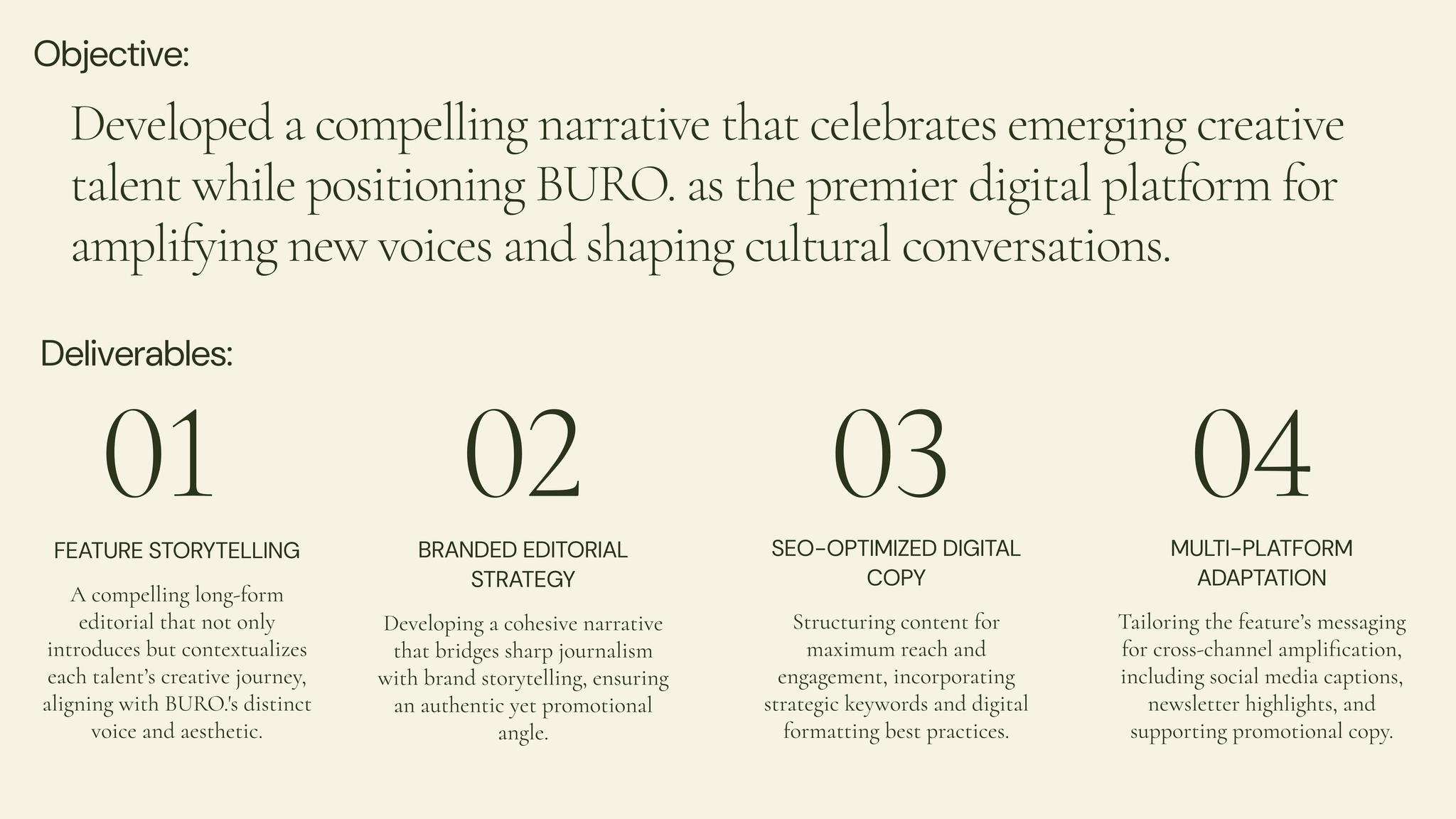 Objective: To craft a compelling narrative that introduces and elevates the next generation of creative talent, positioning BURO. as a platform that champions new voices and shapes cultural conversations.